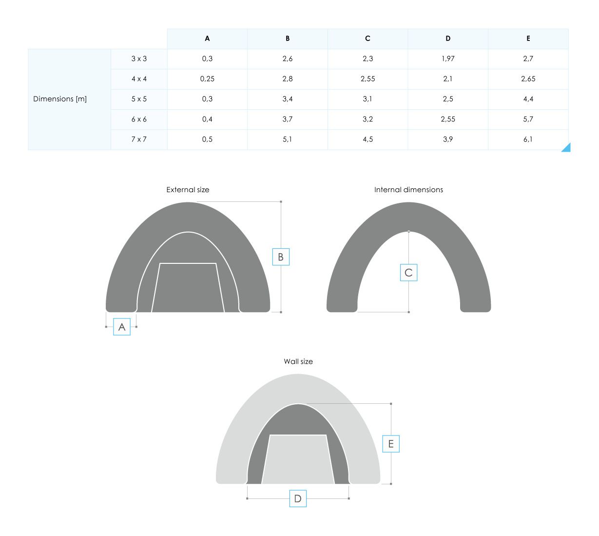 The inflatable gazebo can range in size from 3x3m to 7x7m. Depending on the size, the diameter of the structural tubes ranges from 25 cm to 50 cm. The interior of the legs is designed with polyurethane with a weight of 300 g/m2, and the permanent connection of the structural elements makes the tent more stable and resistant to weather conditions.