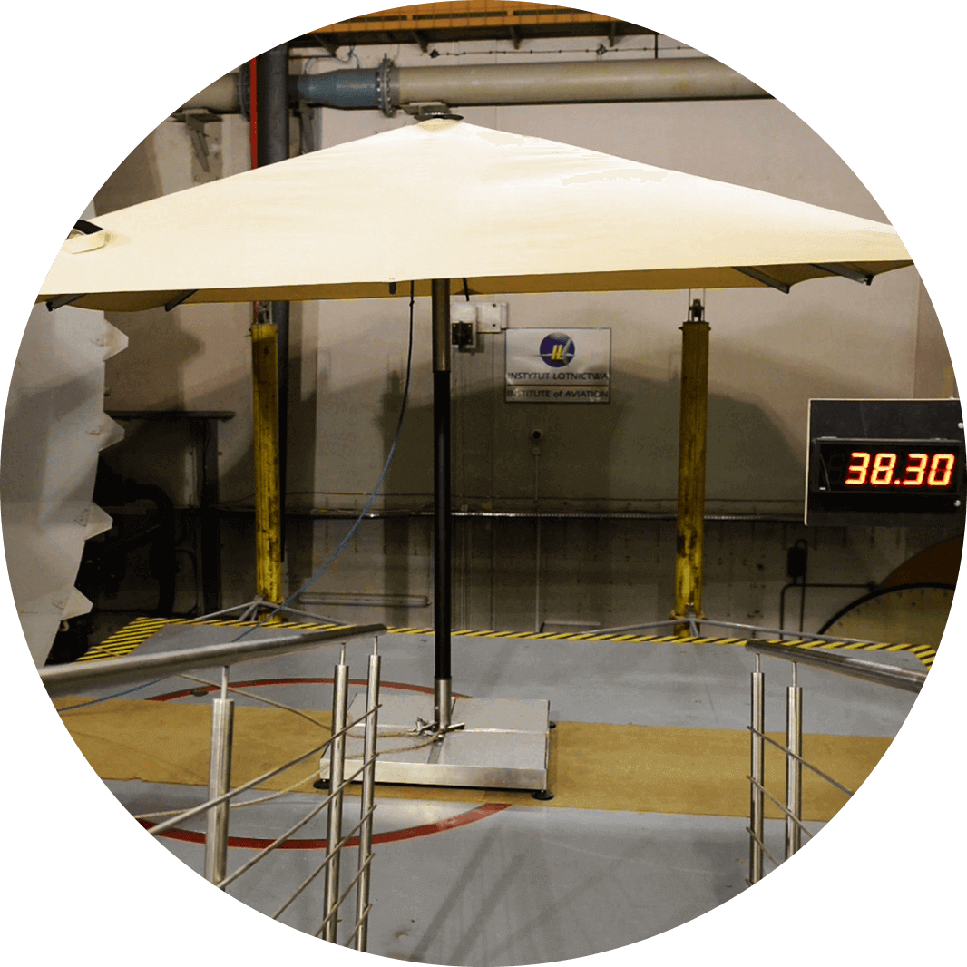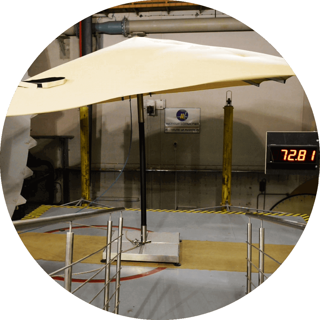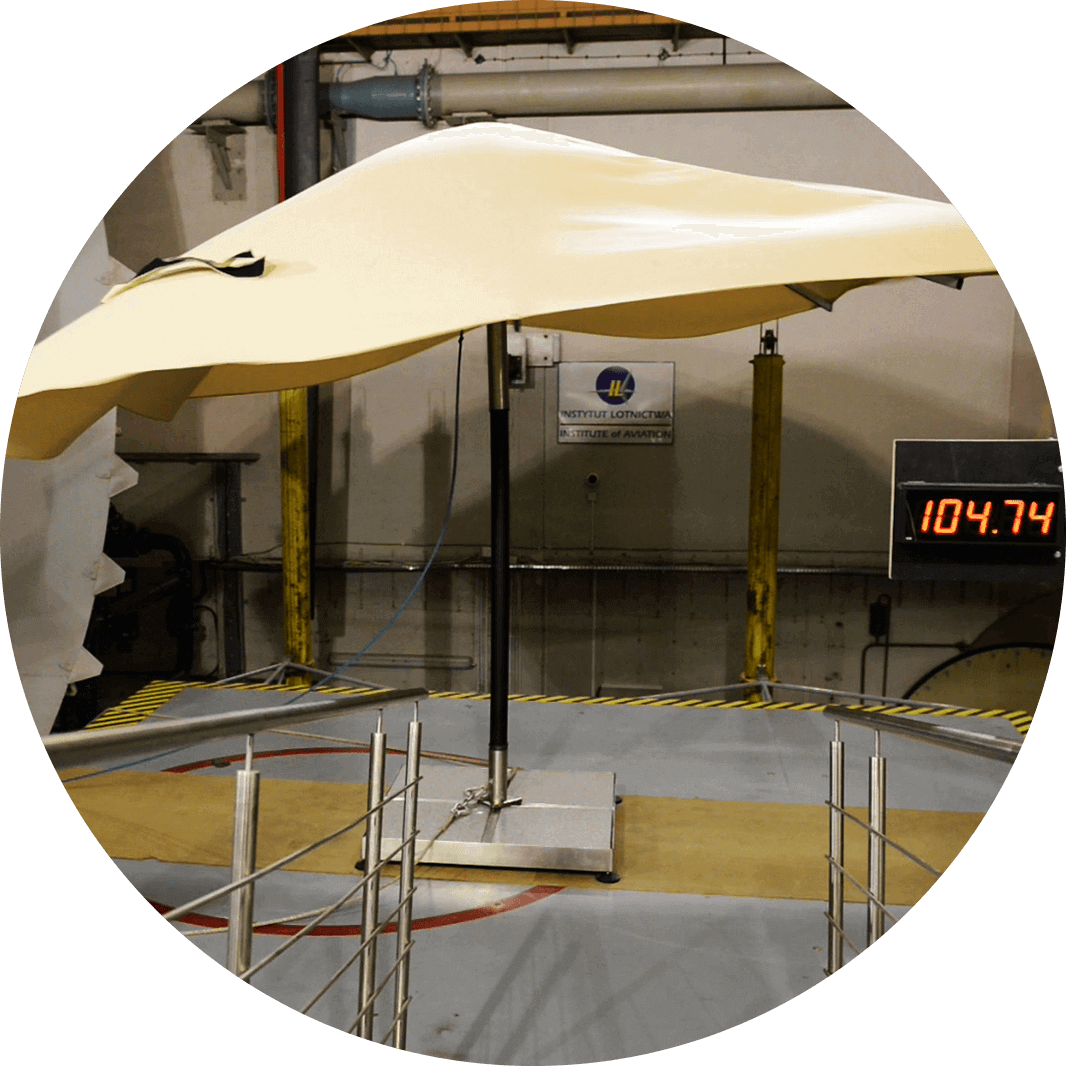 Podczas ekstremalnych testów wytrzymałościowych w tunelu aerodynamicznym Instytutu Lotnictwa w Warszawie rozłożony parasol wytrzymywał wiatr o prędkości ponad 100 km/h!