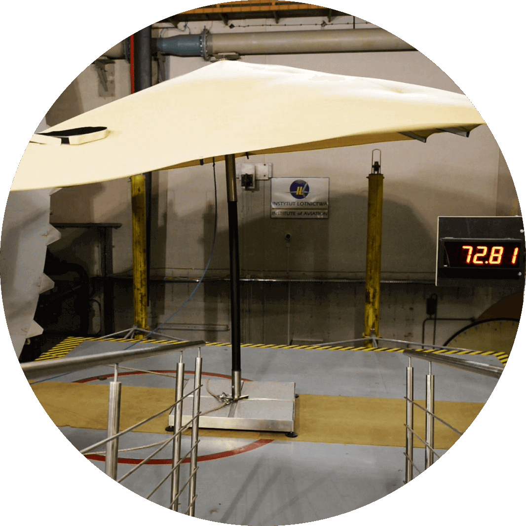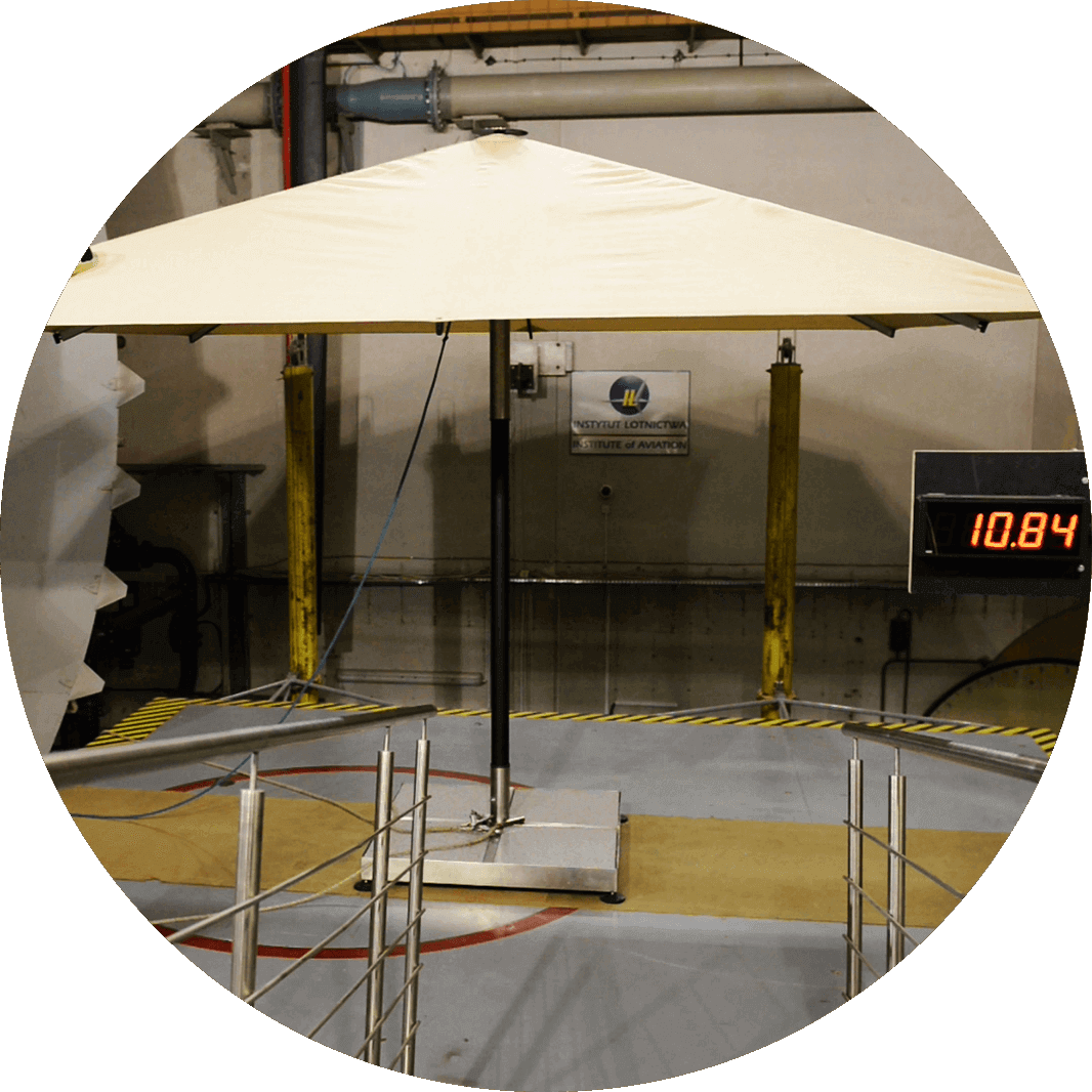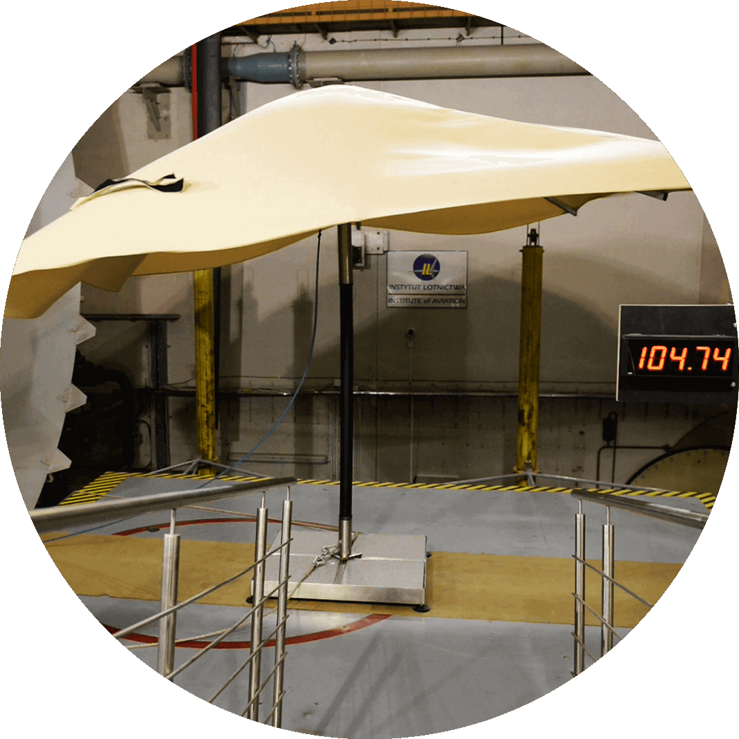 Podczas ekstremalnych testów wytrzymałościowych w tunelu aerodynamicznym Instytutu Lotnictwa w Warszawie rozłożony parasol wytrzymywał wiatr o prędkości ponad 100 km/h!