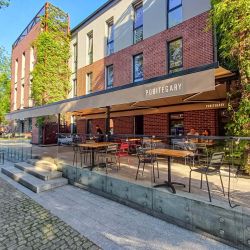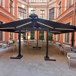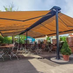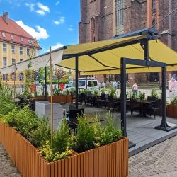 Wolnostojąca lub kotwiona do podłoża markiza, doskonała do ogródków restauracyjnych, nie wymaga montażu do ściany budynku