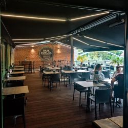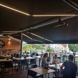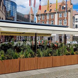 Modułowa konstrukcja markizy umożliwia łatwą rozbudowę i modyfikację, dostosowując się do zmieniających potrzeb ogródka restauracyjnego.