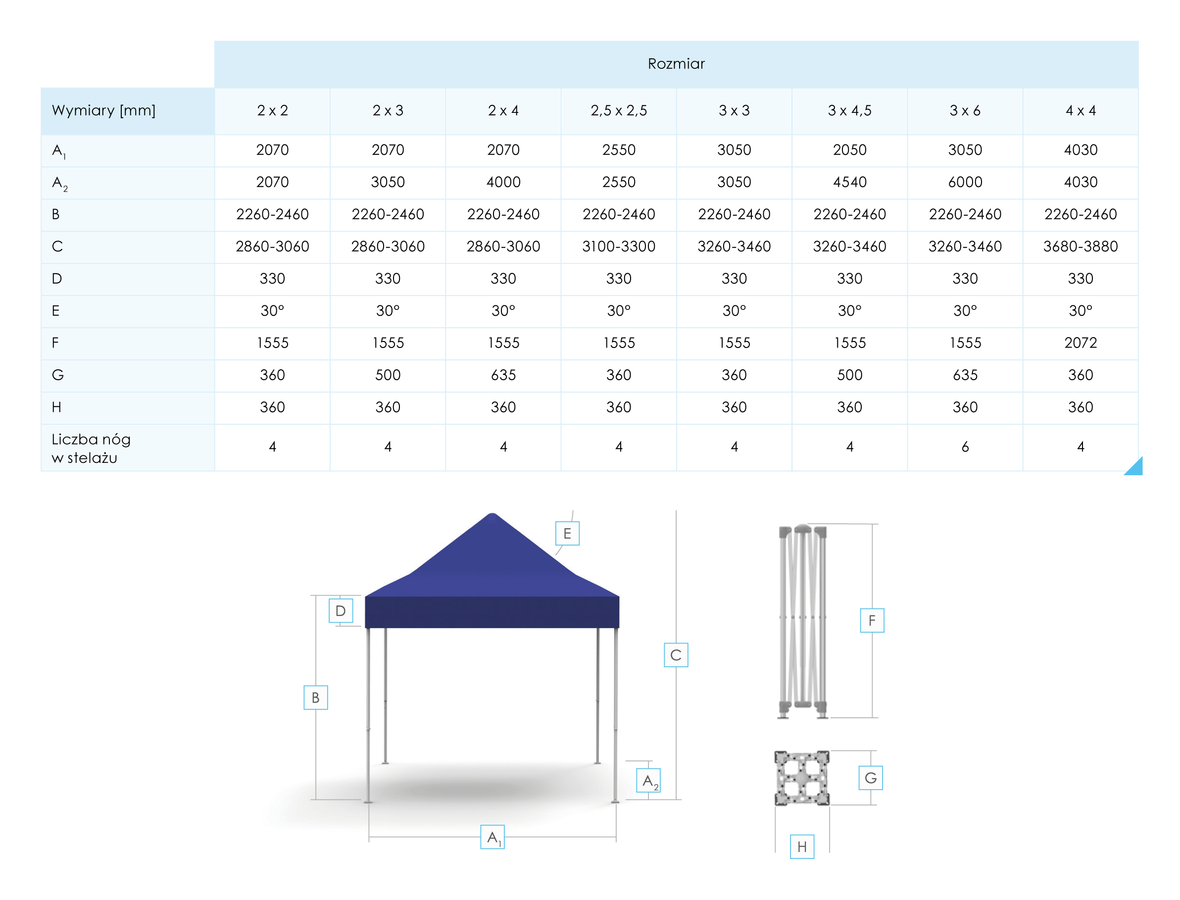 Namiot szybkorozkładalny dostępny jest w ośmiu wariantach rozmiarowych, od kompaktowego 2×2 m po przestronny 3x6m, co pozwala precyzyjnie dobrać powierzchnię do skali i charakteru eventu.