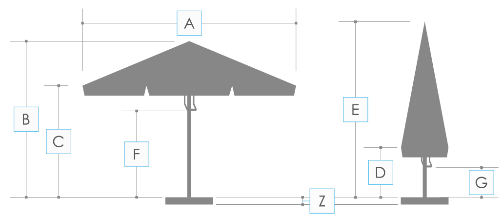 Poszycie parasola prostokątnego wykonano z poliestrowej tkaniny pozwalającej na pełną personalizację dowolnym nadrukiem. Standardem wykończenia czaszy jest wentyl zapewniający odpowiednią cyrkulację powietrza. Całość prostokątnego parasola montowana jest do rozkładanej krzyżakowej podstawy z obciążeniem betonowym lub systemu stałego montażu do podłoża PDZ. Prostokątny kształt umożliwia łączenie kilku parasoli w jedno zadaszenie.