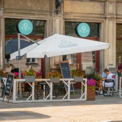 Nasze parasole Rio Plus zamontowane są na wysięgniku, posiadają też system otwierania z możliwością stopniowej regulacji kąta nachylenia czaszy. Dzięki bocznej nodze mamy możliwość ustawienia pod parasolem dowolnego mebla lub całego kompletu mebli. Surowa kolorystyka parasola pozwalająca wyeksponować reklamę w sposób najbardziej widoczny.